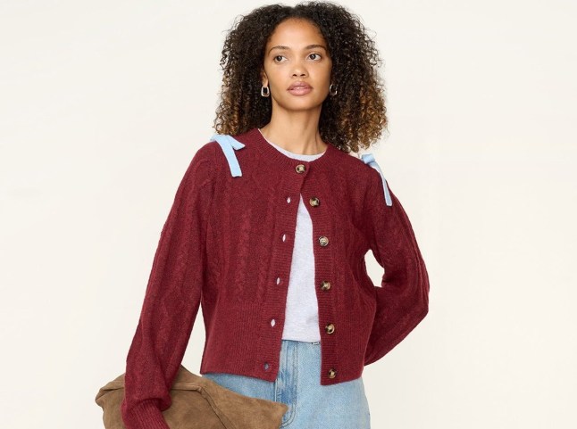 The perfect autumn layer, this adorable Eugina Cardigan from Omnes has everything you need in your staple knitwear. Designed in a rich merlot wool-mix, it features a textured knit that adds depth and warmth to its easy-wearing silhouette, while blue bow details at the shoulders bring an adorable touch.