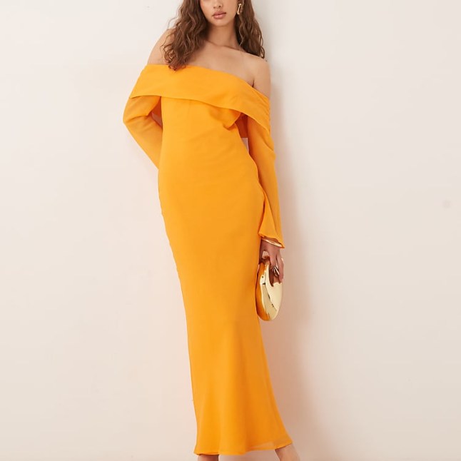 Let’s state the obvious, the ASOS DESIGN Fold Over Bardot Midi Dress isn’t quite as bright as the Carolina Herrera number, but with long sleeves and a fitted waist, this off-the-shoulder dress bears a pretty striking resemblance to its designer counterpart.