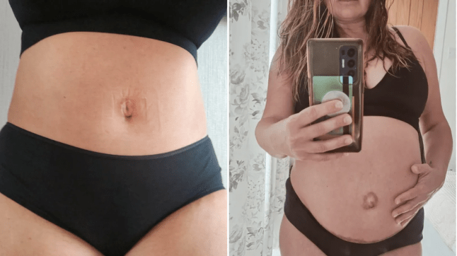 Gemma just after her tummy tuck (left) and Gemma pregnant post-tummy tuck (Picture: Tom Wren / SWNS)