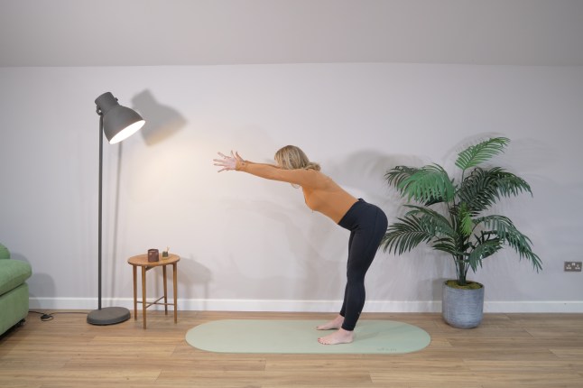 How to do it: Stand with feet hip-width apart, knees soft. Hinge forwards slightly at the hips (keeping a long spine), and reach your arms forwards as if you’re passing something across a table. Return to standing and repeat.