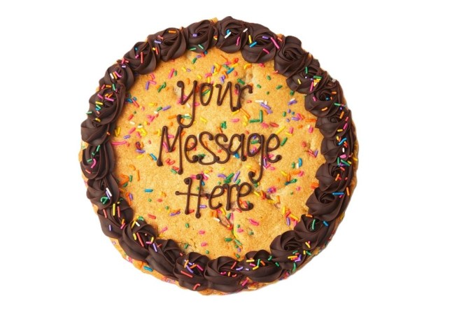 You've got plenty of space to write a message of your choice, while the chocolate chip cookie base, rainbow sprinkles and chocolate fudge frosting is enough to make anyone's mouth water.