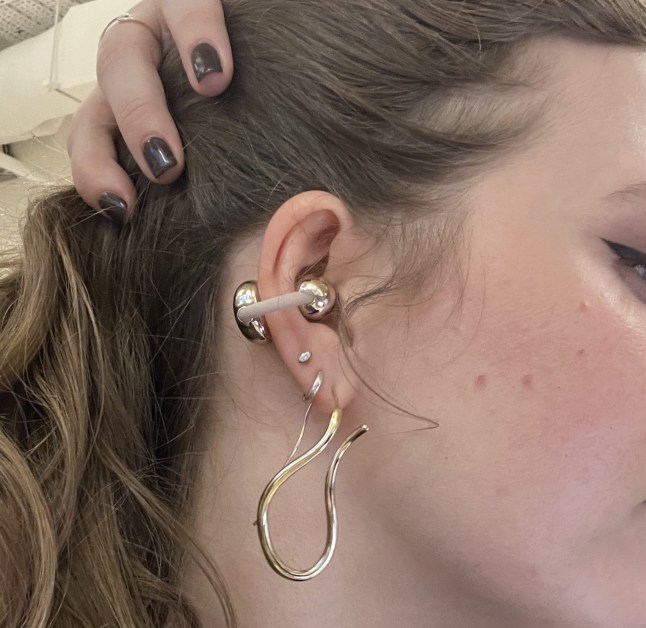 I love the way the earbuds look alongside my earring stack – the pop of metallic shine adds a lot (Picture: Lydia Wheatley)