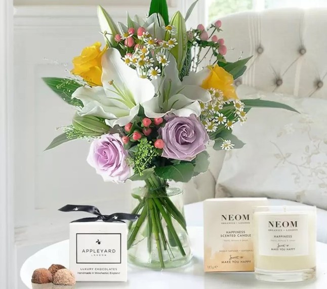 The hamper features a bouquet of fresh oriental lilies with vibrant yellow roses from Appleyard London, a calming scented candle from NEOM Organics and six gourmet chocolate truffles.